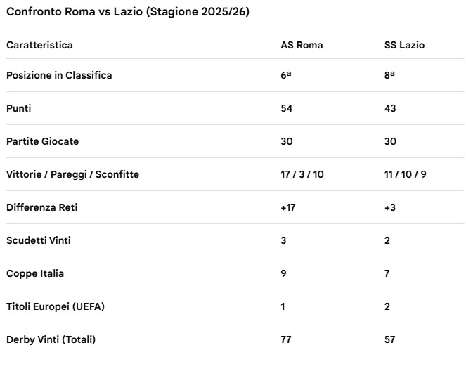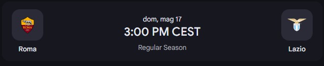 Il prossimo derby di Serie A tra Roma e Lazio è in programma per domenica 17 maggio 2026 alle ore 15:00, in occasione della 37ª giornata del campionato 2025/2026. Il Derby della Capitale tra Roma e Lazio, rappresenta una delle sfide più sentite del calcio italiano.